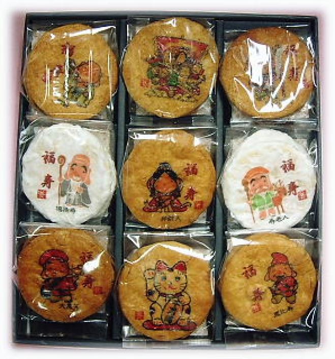 | 特徴 | 天一の美味しい堅焼きせんべい「天一丸」(秋田小町)をベースに縁起の良い七福人のお姿を描いてある味の逸品です。 人には家内安全・商売繁盛。縁結びなど、様々な願望があります。 七福人は、これらの願望に応え人々に幸福をもたらす神々として古くから信仰の象徴とされています。 ◆2,800円 ◆1,575円 ◆850円 のセットもあります。 |