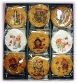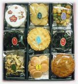 天一の美味しい煎餅、おかき、あられを9種類ほど集めました。 海苔巻きあられ、鉄板焼など味の逸品揃いです。 進物の中の「アート煎餅」は季節により柄が変わります。